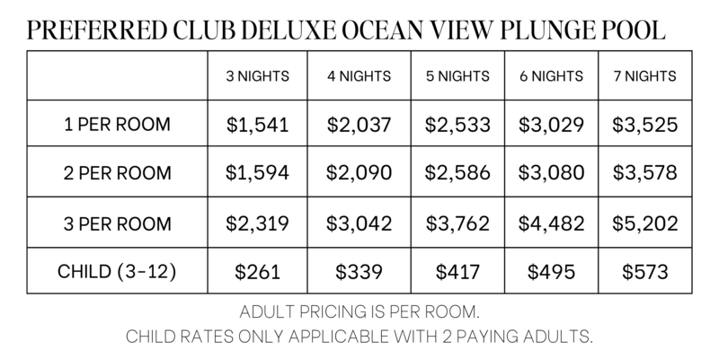 The Preferred Club Deluxe Ocean View Plunge Pool at Dreams Vista Golf & Spa Resort features a king size bed or two double beds, terrace with access to plunge pool, rain shower, and Preferred Club amenities. Rooms with king-size bed have living area with sofa bed.